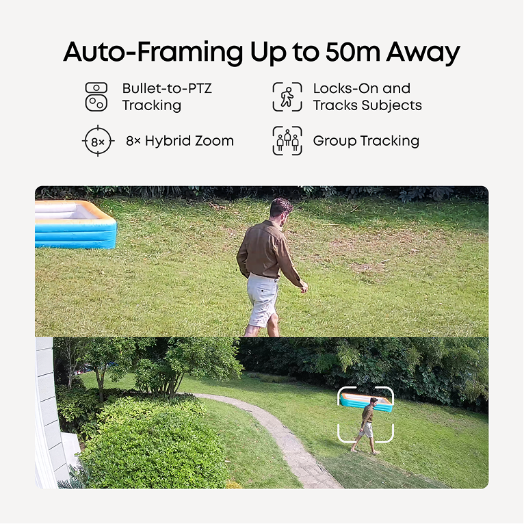 When the upper camera detects a subject, the lower PTZ camera locks on, automatically tracking and framing them with sharp, centered close-ups and 8× auto zoom—even from 164 ft (50 m) away. Group Tracking: Automatically adjusts zoom to keep all subjects in frame, even if they move, until one exits the field of view.