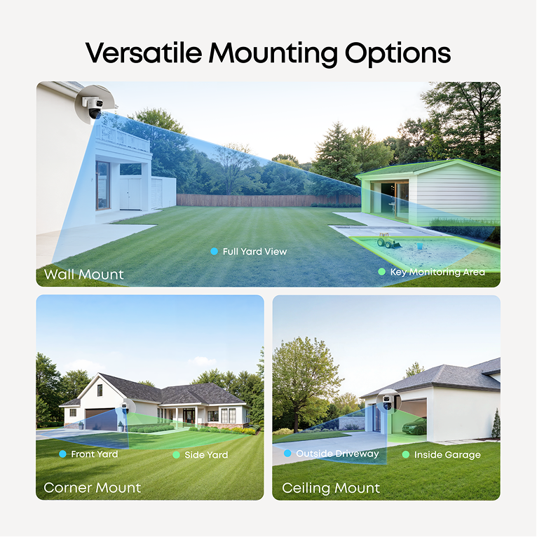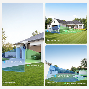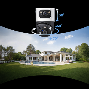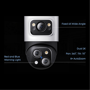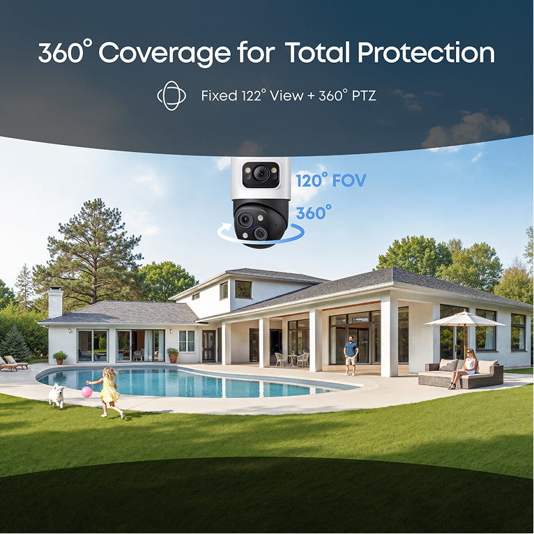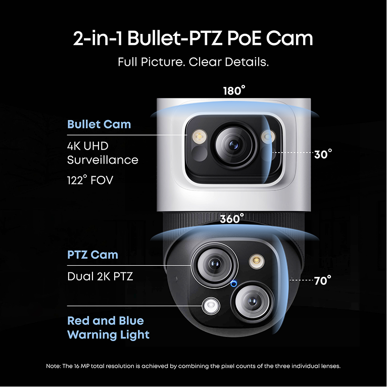 Triple-Lens System: Captures every detail in 16MP clarity. Fixed 4K Wide-Angle, 122° ultra-wide field of view. Dual 2K PTZ, 360° panoramic view with full-range motion. 360° Pan, 70° Tilt, No blind spots. 8× Optical Auto-Zoom, Real-time precise tracking. Note: The 16 MP total resolution is achieved by combining the pixel counts of the three individual lenses.