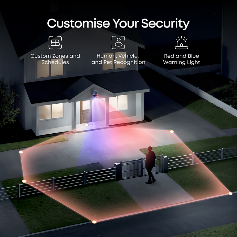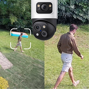 The upper 4K wide-angle camera provides a 122° fixed view of the entire scene, while the lower 2K PTZ camera pans 360° for complete coverage. Bullet-to-PTZ Tracking: When the bullet cam detects a subject, the PTZ locks on and precisely tracks it for continuous monitoring.