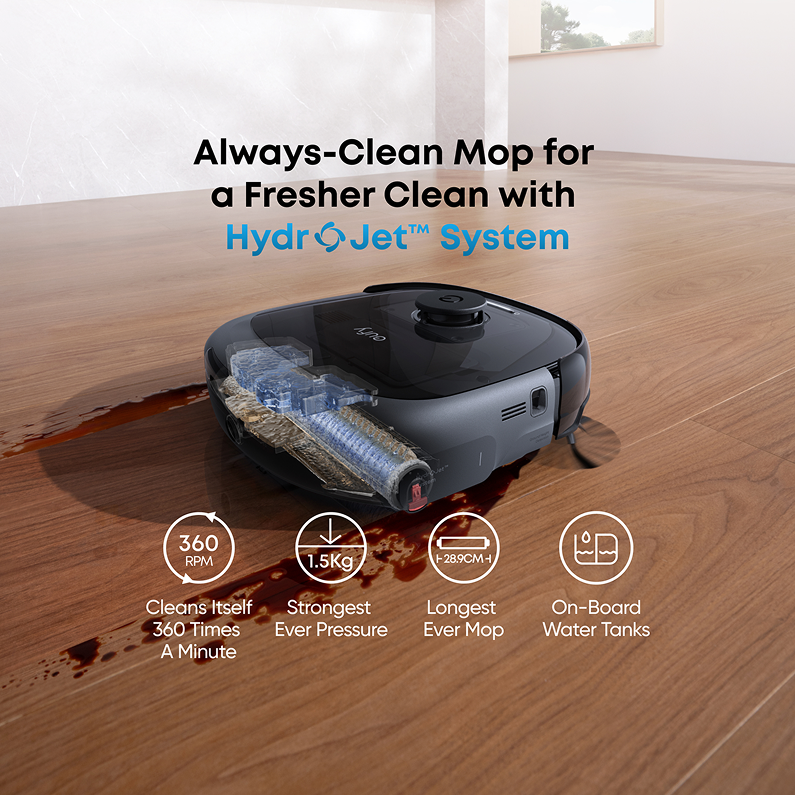 HydroJet System with a two-scraper structure cleans the roller mop 360 times per minute, ensuring continuous cleanliness. With 1.5kg downward pressure and an 11.4 in mop, the E28 mimics meticulous hand scrubbing to tackle even the most stubborn stains.