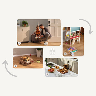 Watch entryways, the kids play area, or a pet's bed. Cycles between locations and keeps two eyes on the places that matter.